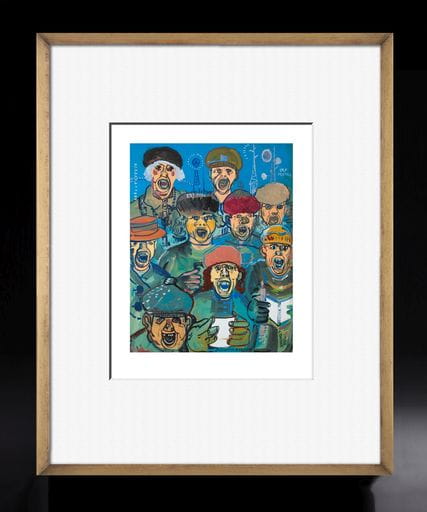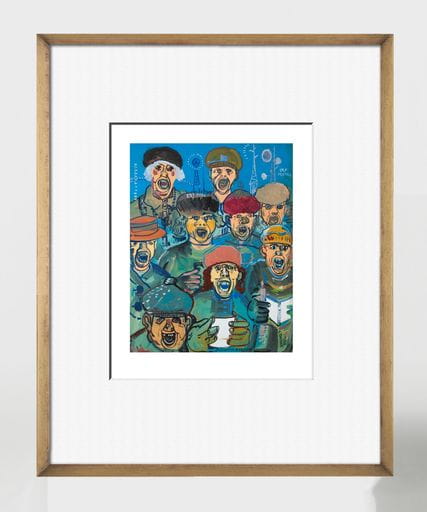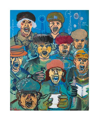 The influences of Bernard Buffett's figurativeness and Nikifor Krynicki's perspective were reflected in Dwurnik's work. The mocking portraits of people forming a crowded composition are the artist's commentary on the surrounding reality. Notes on canvas in the form of radio frequencies are an incredible nonchalance borrowed from Nikifor's paintings. As if these words were to become the completion of the whole. A gaping mouth and broken teeth are a caricatured performance, a wink of the eye and, undoubtedly, an offer for the brave!