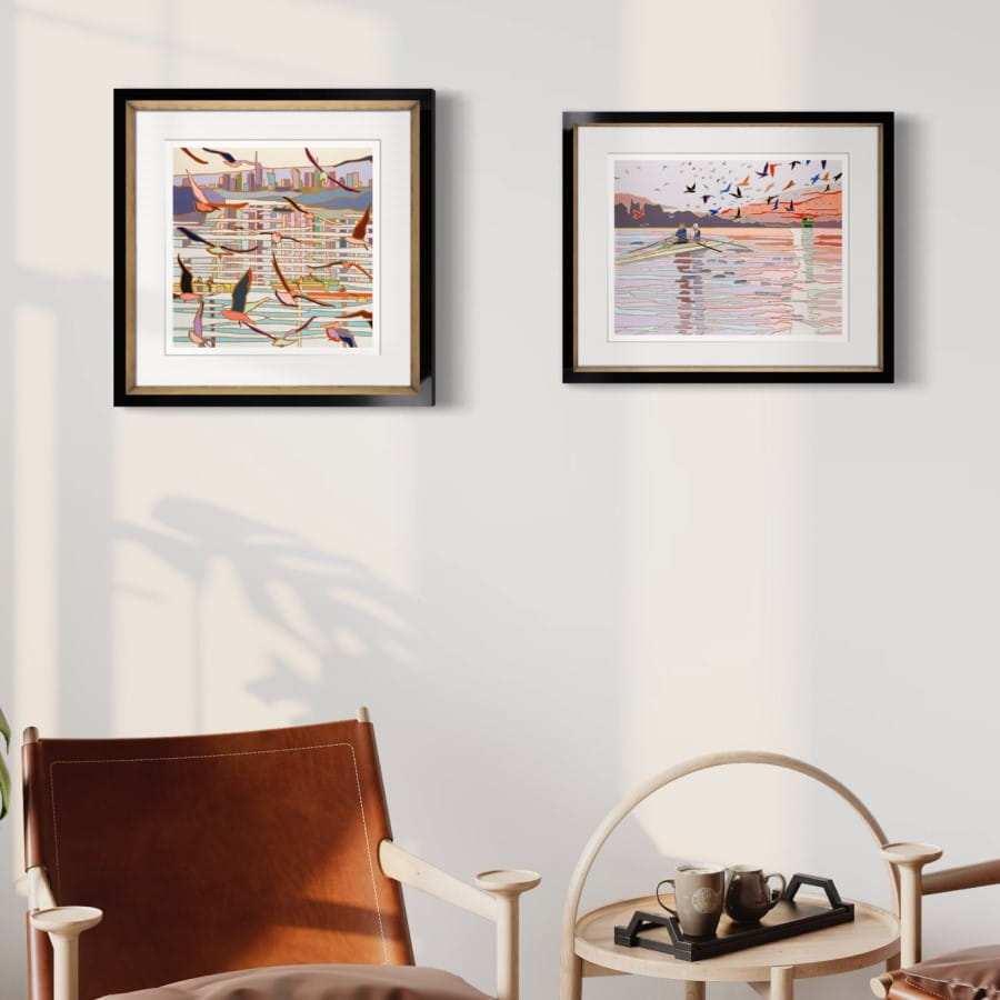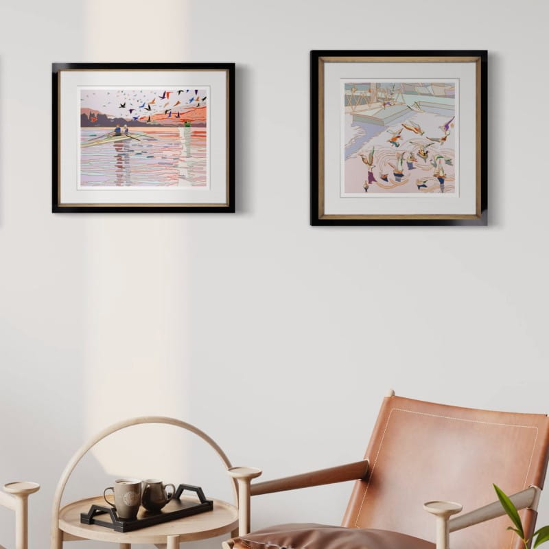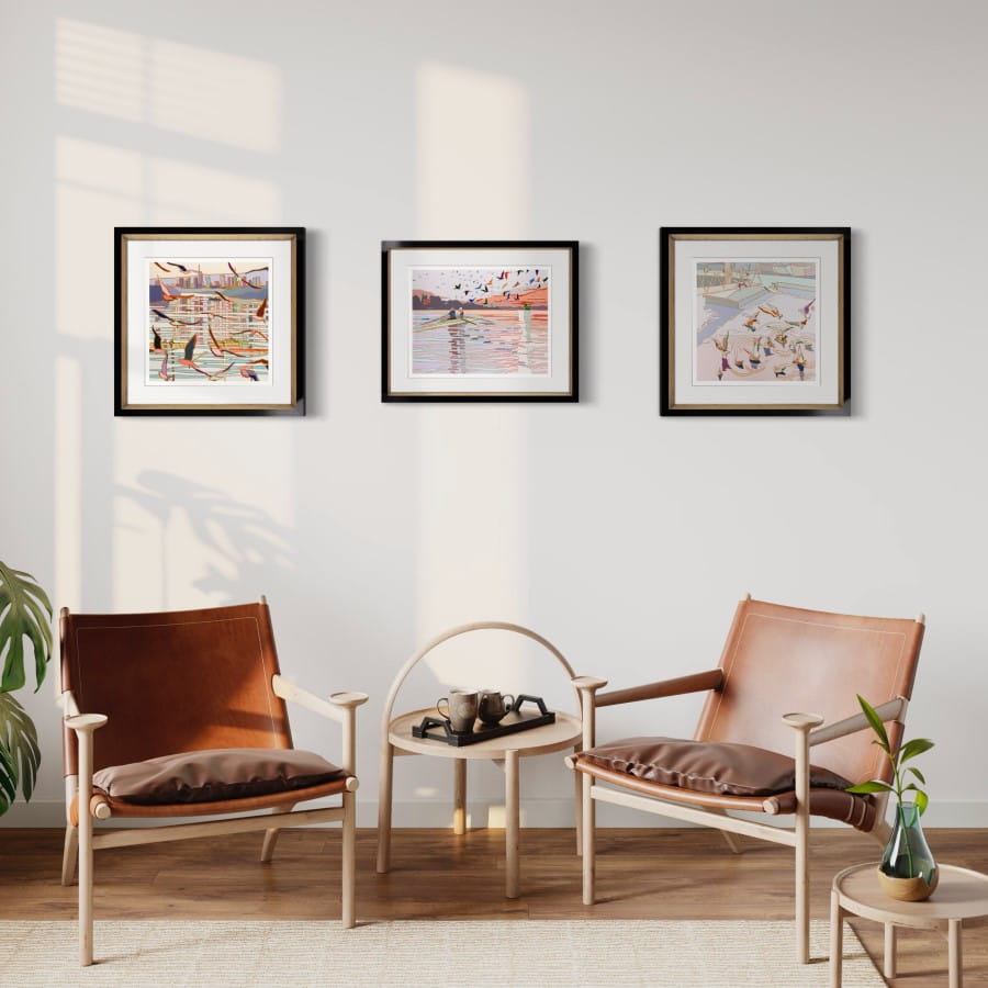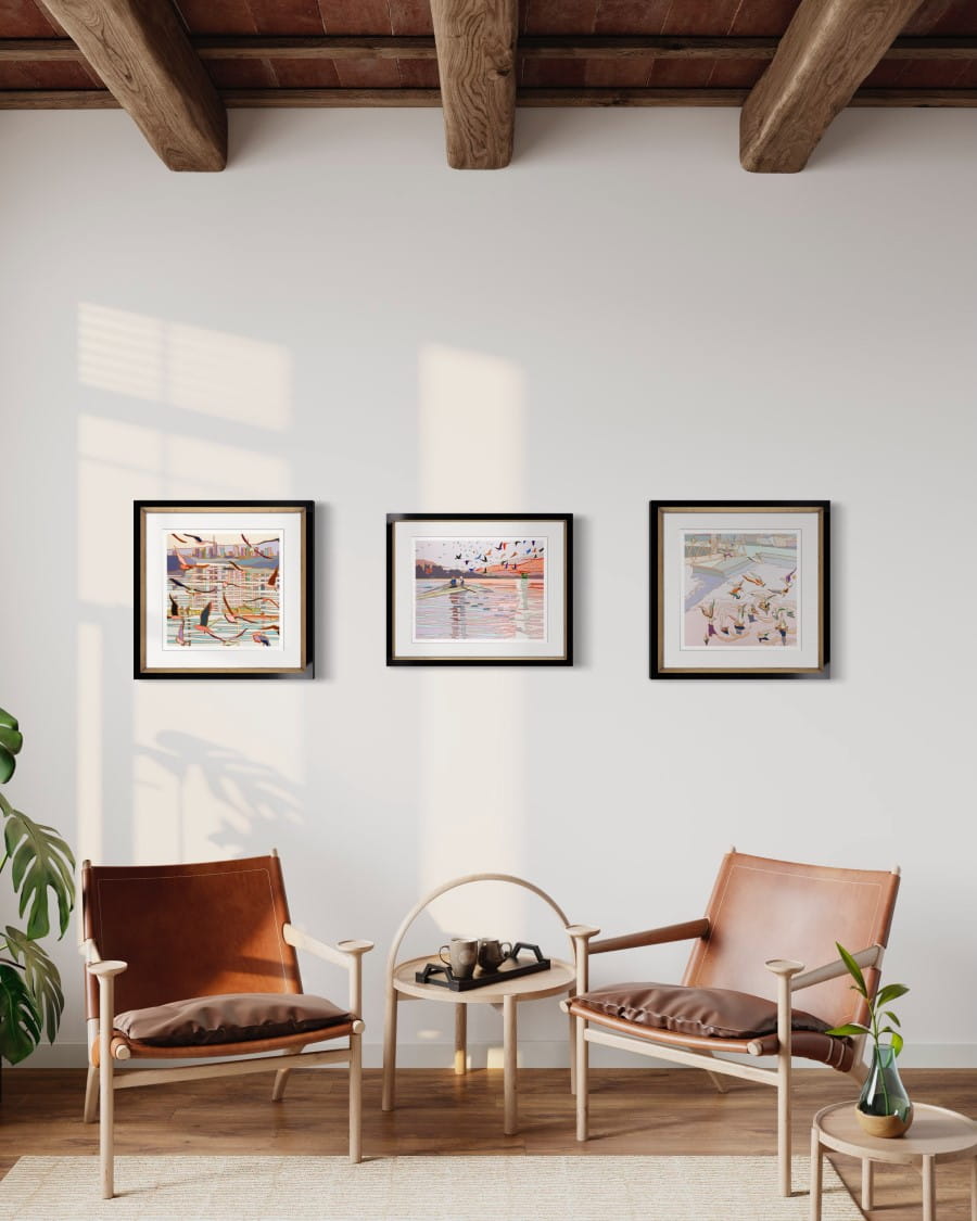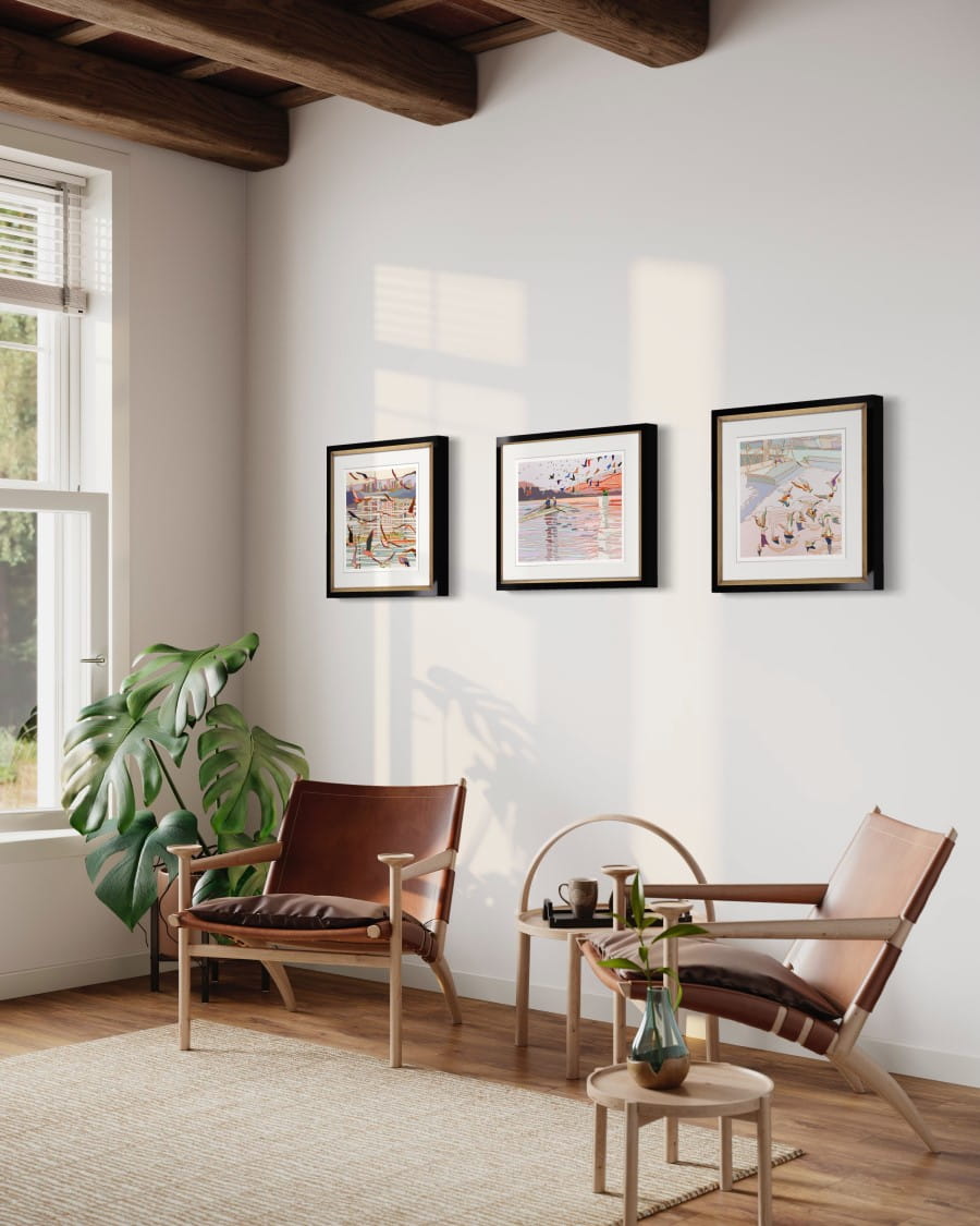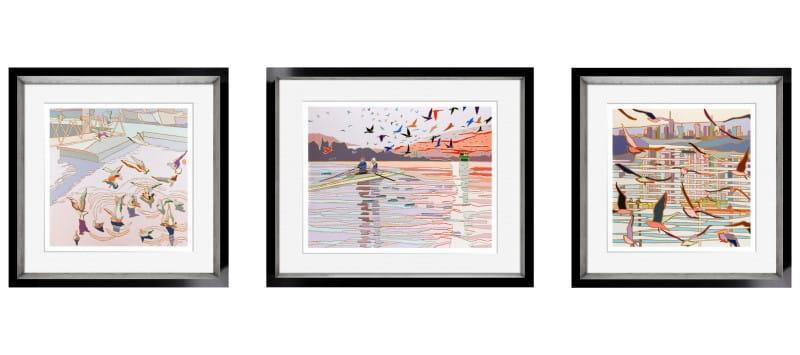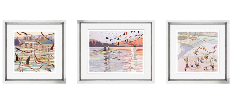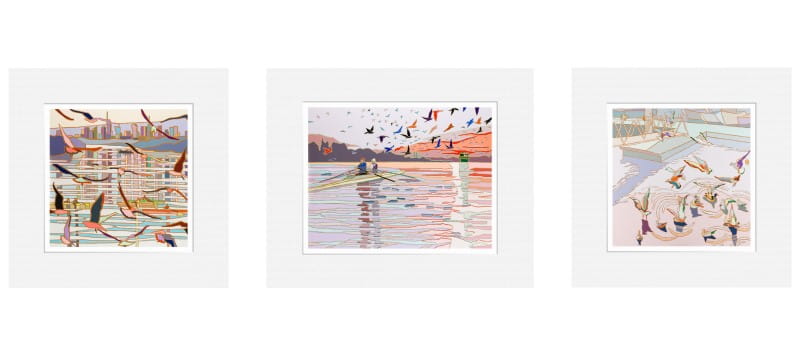 Canoes, water surface, the setting sun... Jędrzejczyk's works are like a nostalgic postcard from a holiday. The collection 'In the Air' depicts landscapes with birds in flight. Their wings enliven the patches of colour, and the artist's characteristic clear contours make the triptych very unique.