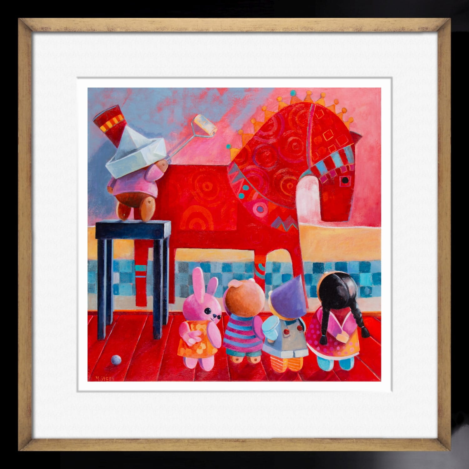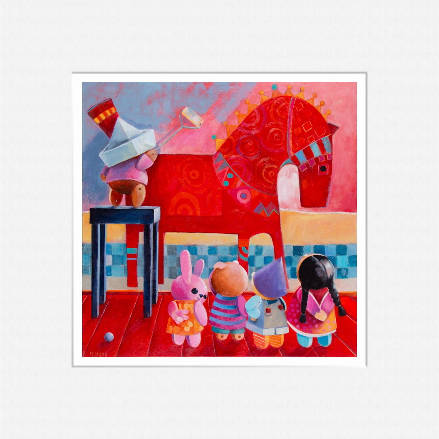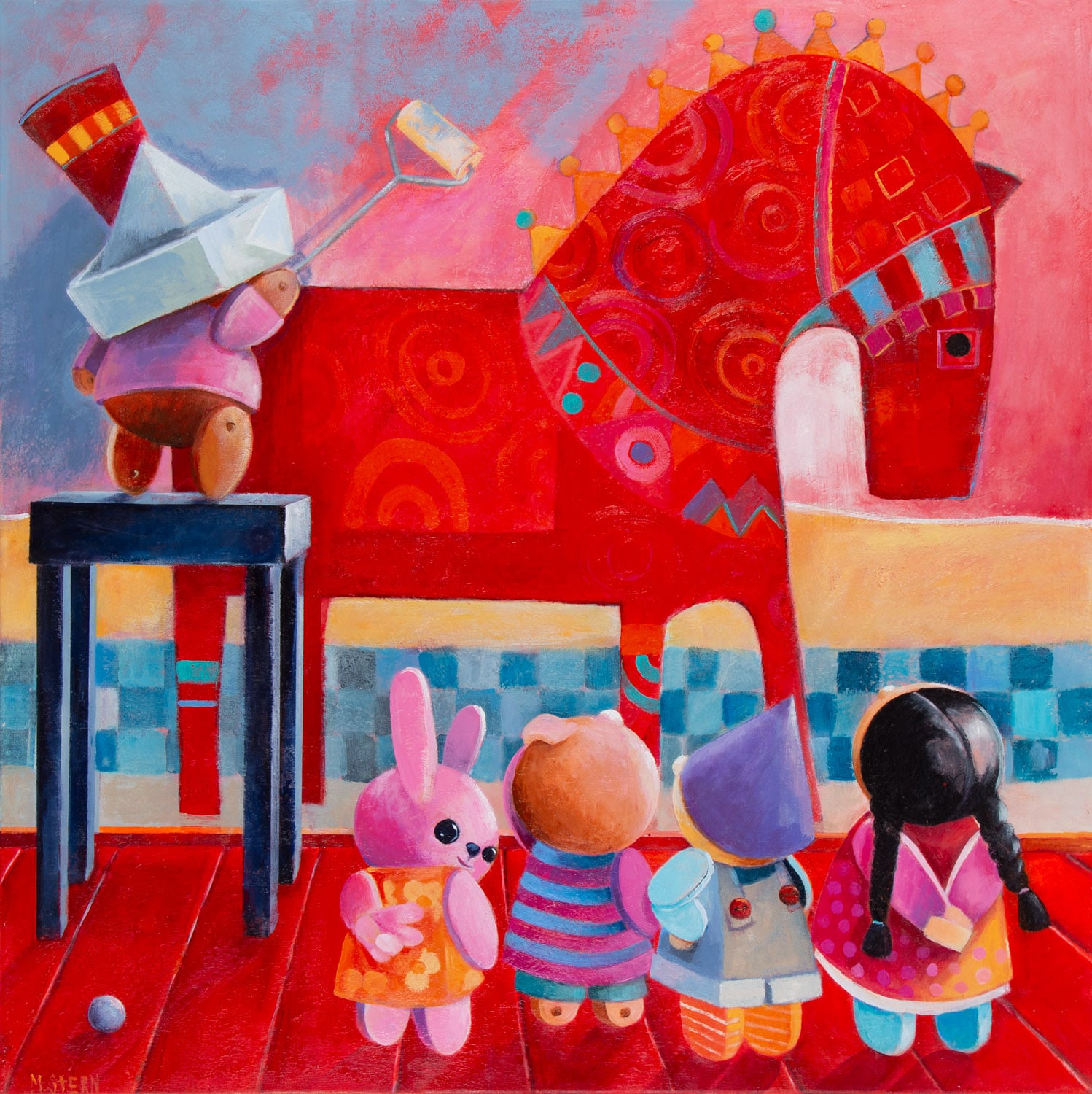„Koń jaki jest, każdy widzi”, pisał autor Nowych Aten, dając do zrozumienia, że oczywistości nie wymagają tłumaczenia. Mirella Stern odpowiada na to słynne zdanie, upominając się o głos najmłodszych. Koń jest wtedy — gdzie i kiedy jest jakikolwiek koń z 2019 roku to nie tylko doskonałe wykorzystanie soczystej czerwieni w kubistycznym krajobrazie. To przede wszystkim pytanie o genezę artystycznej wyobraźni, której najpotężniejsze moce budzą się właśnie w dzieciństwie.