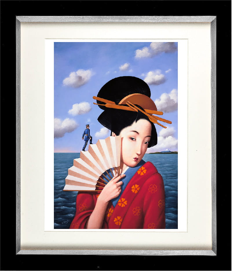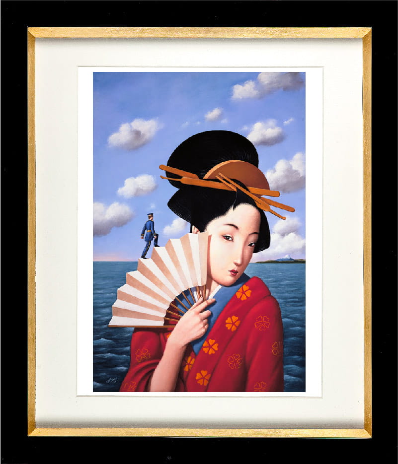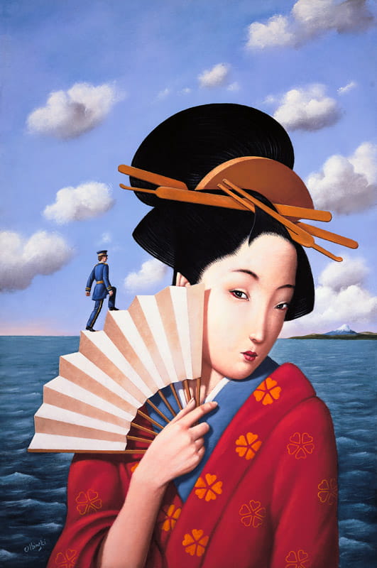 Na wzgórzu, w pobliżu japońskiego portu Nagasaki ma odbyć się ślub młodego porucznika marynarki amerykańskiej, Pinkertona z gejszą Cho-Cho-San nazwaną przez niego Butterfly. Tak rozpoczyna się opowieść w operze z 1904 roku Giacoma Pucciniego. Obraz Olbińskiego oryginalnie powstał blisko sto lat później, bo w 2000 roku. Współtwórca polskiej szkoły plakatu posługuje się tutaj graficznym przedstawieniem tytułowej bohaterki. Od zawsze czerpie z kultury i sztuki, wykorzystując ponownie znane motywy i nadając im nową wartość. Znaleźć możemy bowiem związek między włoską muzyką operową, a jego twórczością. Pod tym względem charakterystyczne jest łączenie fantastyki z realistycznym wyobrażeniem, a także przedstawianie relacji romantycznych.